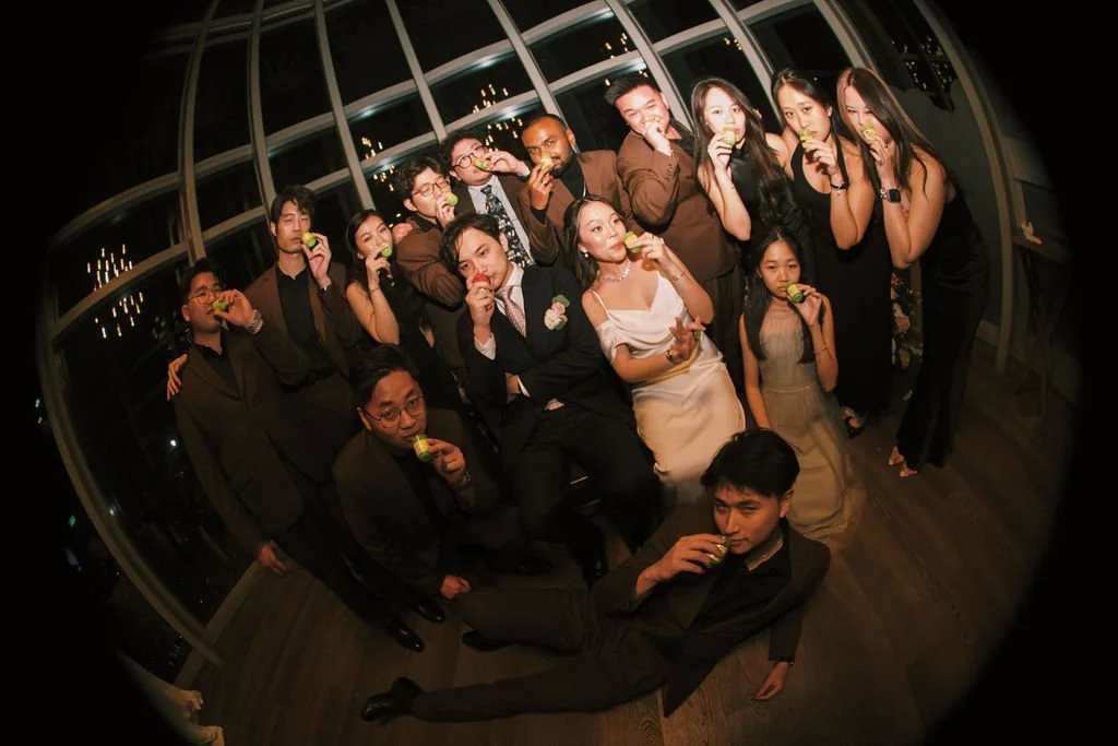 Perched high above Orchard Road, the venue offered sweeping skyline views and an atmosphere that felt elegant without the formality of a traditional banquet. It reflected exactly what Gabrielle and Aaron had envisioned. A celebration that felt elevated, intimate, and slightly more relaxed.