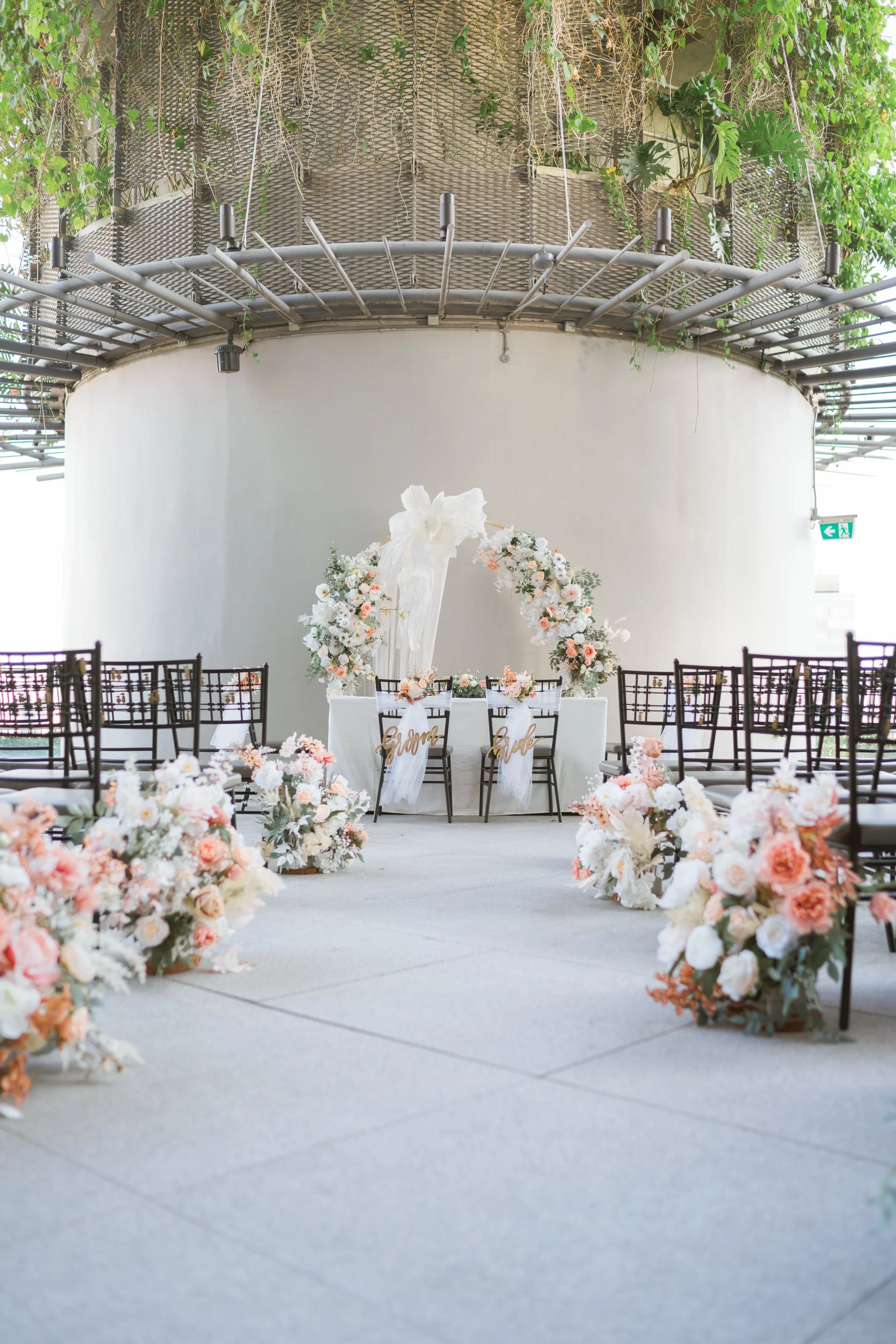 The floral arrangements were an enchanting mix of white orchids, blush roses, and delicate greenery. From the aisle décor to the statement arch framing their solemnisation, the design captured the essence of romantic minimalism. The styling leaned on soft tones that looked effortlessly chic, proving that thoughtful choices go a long way in elevating aesthetics.