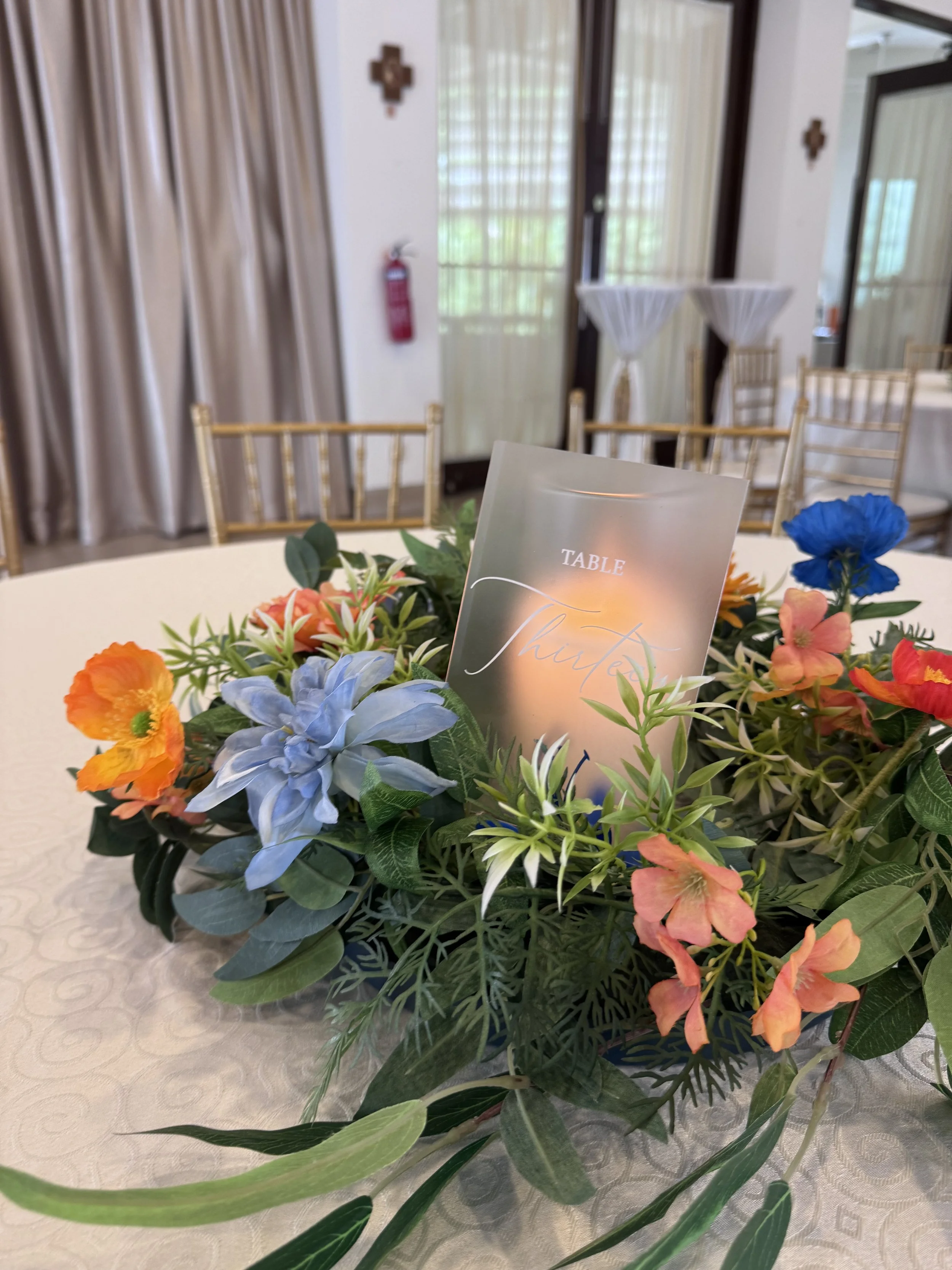 The wedding style was eclectic, nature-inspired, and meaningful. Their design incorporated vibrant florals, modern guest experiences, and sustainable elements. Their chosen color palette of orange and blue reflected the sun and moon, symbolizing their individuality, while lush tropical greenery captured their love of nature. Spring and autumn tones tied it all together, representing both their individual and shared journeys.